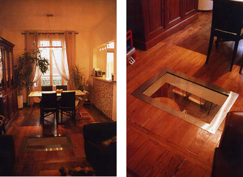 -         Au rez-de-chaussée, nous avons créé une percée dans le parquet et placé une dalle de verre feuilleté qui permet aux adultes de surveiller les enfants...à la cave devenue salle de home-cinéma