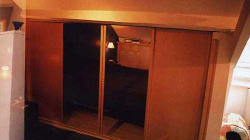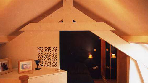 La ferme centrale marque la délimitation des zones de vie : une partie de la pièce est affectée à la chambre ; les sous-pentes de toits trop basses pour être habitables sont utilisées en tant que rangements et penderies. Cette délimitation est renforcée par le biais de claustra en plâtre (fabriqués dans notre atelier) de façon à préserver une intimité.