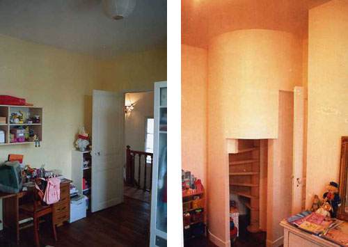 -         Au premier étage, le challenge a consisté à réussir à placer un escalier hélicoïdal fermé dans une cloison courbe, en lieu et place de jonction des cloisons. Il n'empiète que très peu sur les deux chambres d'enfants et le dessous de l'escalier sert de petite penderie dans l'une des deux chambres. Aucune place perdue !