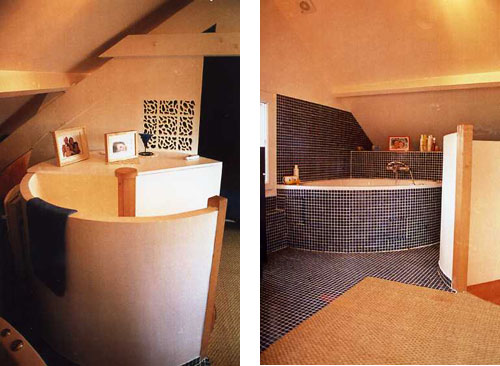 La deuxième partie de la pièce créée est très lumineuse par notre installation d'un grand velux : elle reçoit l'arrivée de l'escalier hélicoïdal et la salle da bain équipée d'une baignoire balnéo, d'un ballon d'au chaude de 150 L cachés dans la sous-pente et d'un placard qui reçoit les serviettes. La suite parentale est née....