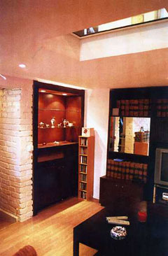 -         Au sous-sol,  nous avons transformé une partie de la cave en salle de jeux vidéo/home cinéma. Un cache-radiateur/vitrine a été créé dans un recoin de la pièce. Un meuble home Cinéma, emprunt de sobriété, a été placé en fond de pièce. Toute la Hifi a ainsi pu être intégrée sans laisser transparaître des câbles disgracieux. La couleur rouge, théâtrale, ajoute de l'âme à l'usage du lieu.