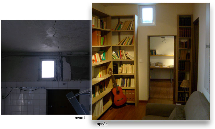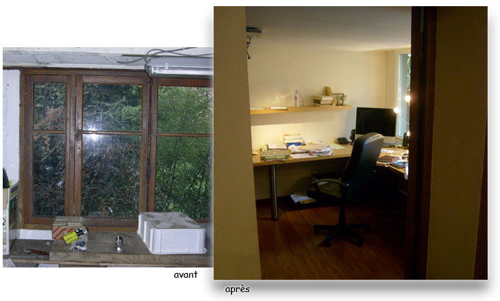 Le labo du boucher, une fois isolé et remanié, est devenu un bureau confortable qui intègre une partie salon de lecture, une bibliothèque/archives (dans l'ancienne chambre froide) et un bureau donnant sur le jardin, au calme.