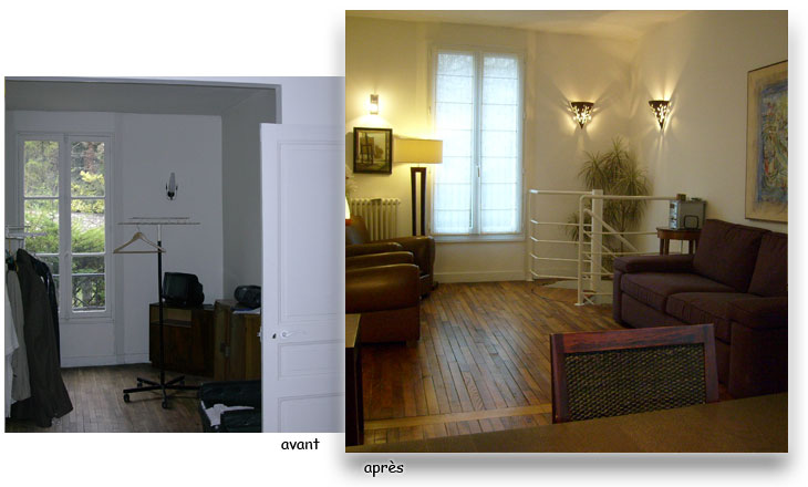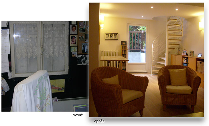 Le rez-de-chaussée disposait d'une salle de bain toute en longueur et sombre, d'une chambre côté rue (bruyant) et d'une petite cuisine côté jardin (calme). Le salon était divisé en deux par une alcôve semi-porteuse.